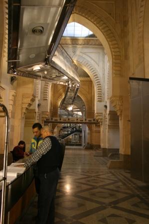 今回の調査では、写本室が移転したばかりのエジプト国立図書館新館(Dar al-Kutub)も調査し、アラビア語及びトルコ語写本の調査、複写を行なった。国立図書館新館はバーブ・アルハルクのイスラーム芸術博物館を改装した建物内に同博物館と併設されている。外見は伝統的なイスラーム建築のスタイルだが内部は近代的な内装で、そのギャップに驚かされる。ここで調査をする際は、受付でパスポートと荷物を預け、受付簿に必要事項を記入するだけで入館することができる。マイクロフィルムを閲覧する順序は、まず検索用PCで目当てのマイクロの請求番号など申請に必要な情報を検索し、閲覧申請書に記入する。それを近くにいる館員に渡すとマイクロを持ってきてくれるので、その館員と共に隣の閲覧室に入り閲覧する。館員の対応はとても親切で、分からないことをたずねると丁寧に教えてくれた。